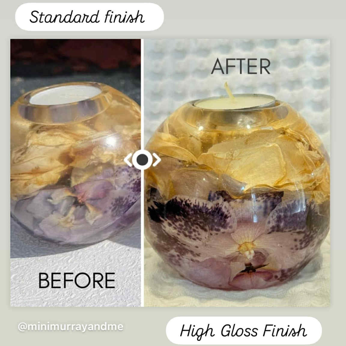 2. A HIGH GLOSS finish, Additional Fees apply - Each piece is expertly sanded and polished, then coated with a high-gloss topcoat for a flawless, glass-like surface. This premium finish enhances the vibrancy of your preserved flowers and gives your keepsake a stunning, diamond-like shine. The edging is then rounded and giving a more domed effect. This option is perfect for those seeking a luxurious, shine that truly stands out.